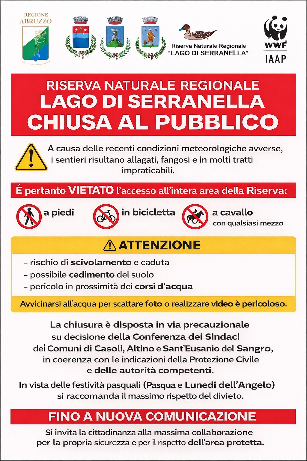 AVVISO CHIUSURA AL PUBBLICO RISERVA NATURALE REGIONALE LAGO DI SERRANELLA FINO A NUOVA COMUNICAZIONE